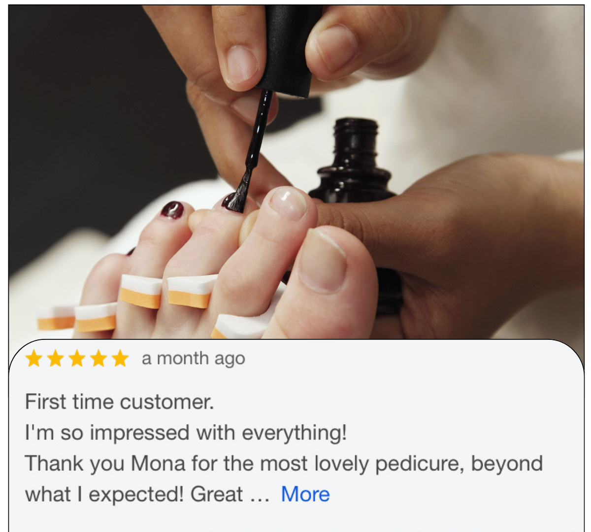 "Excellent pedicure service. Ever since I have been going to Casa D’Blanca Nails, I haven’t had any issues with my feet. I’m free of ingrown nails now. The staff are very nice and accommodating." -Miranda